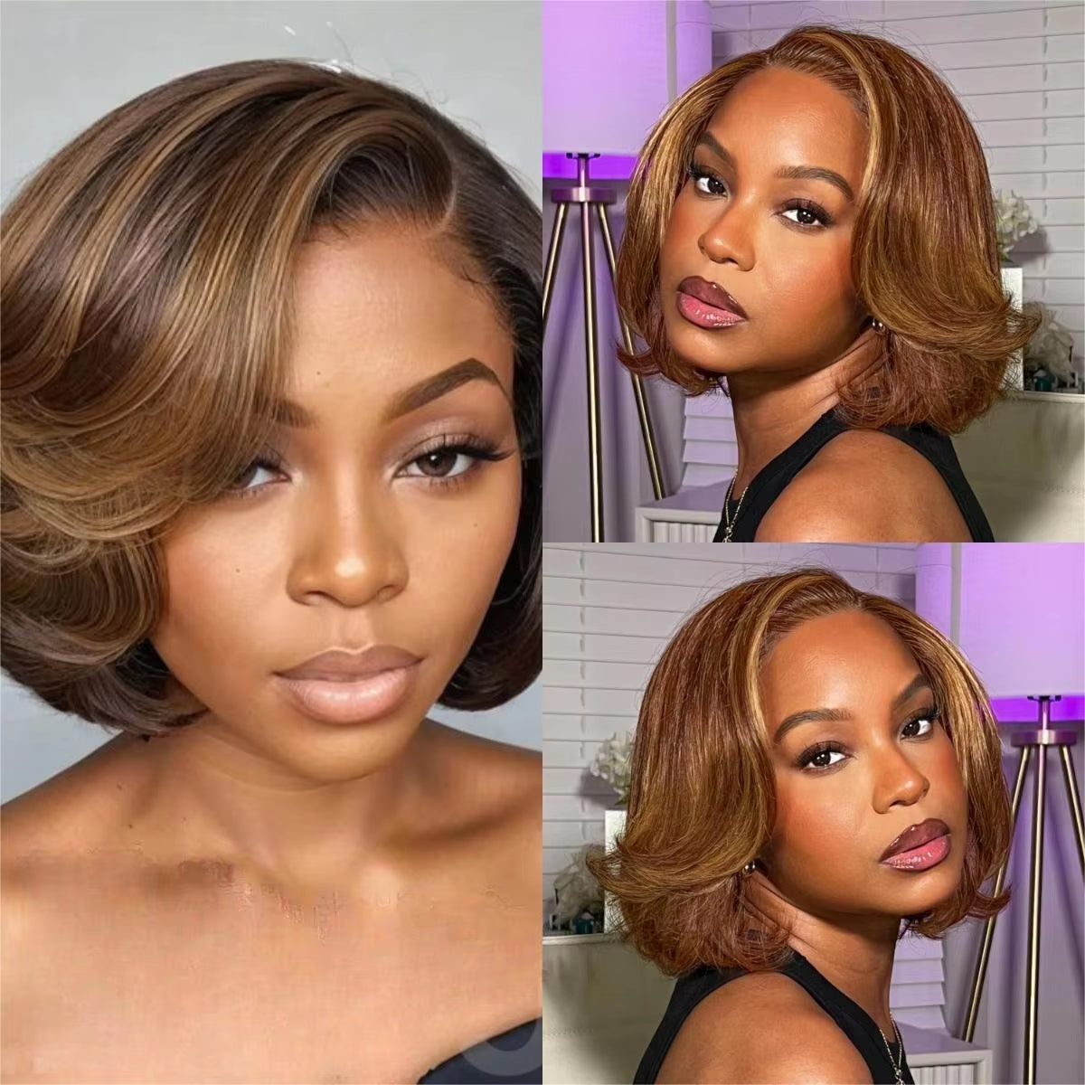 12 Inch Multi-Tone Colored Short Bob Wig 100% Brazilian Human Hair Straight, Curly or Body Wave Transparent Lace Front Pre Plucked For Women